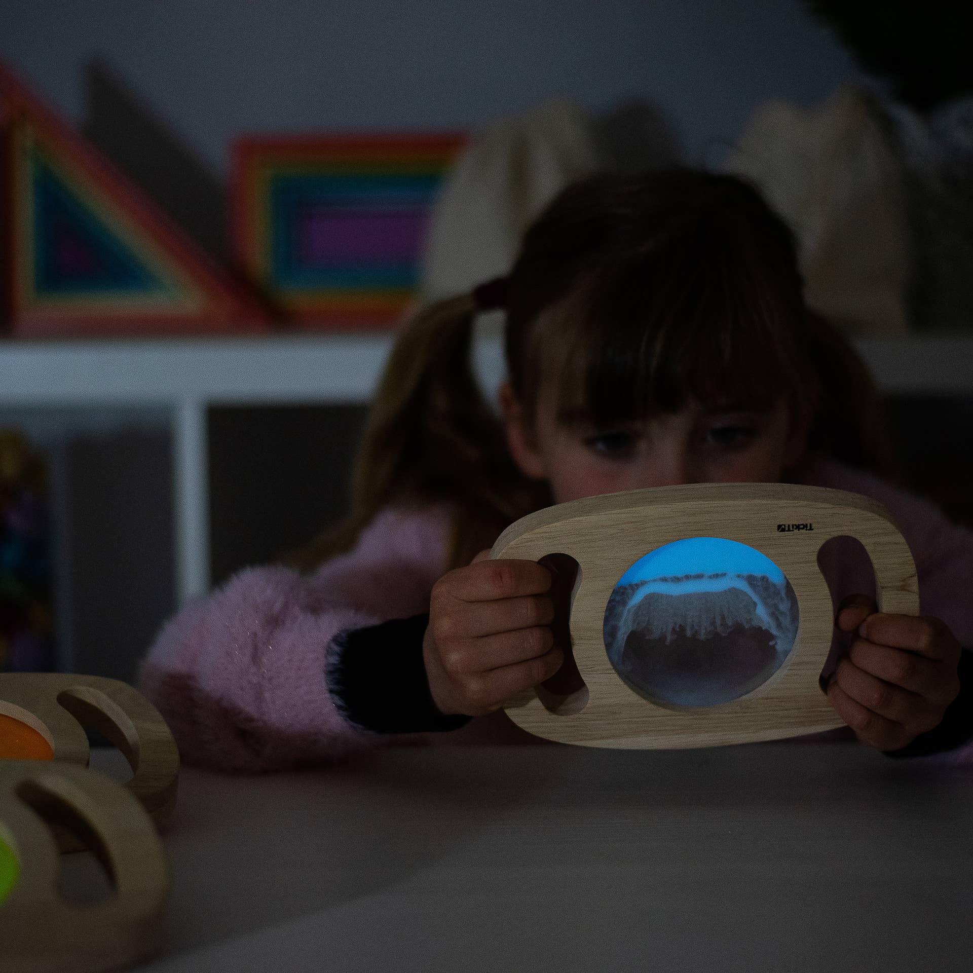 Dieser wunderschöne Rahmen aus Gummibaumholz mit griffigen Griffen verfügt über ein faszinierendes Panel, das im Dunkeln leuchtet. Es wird aktiviert, indem es in helles Licht gelassen wird. Wenn es in eine dunkle Höhle gebracht wird, leuchtet es wie von Zauberhand in leuchtendem Blau.