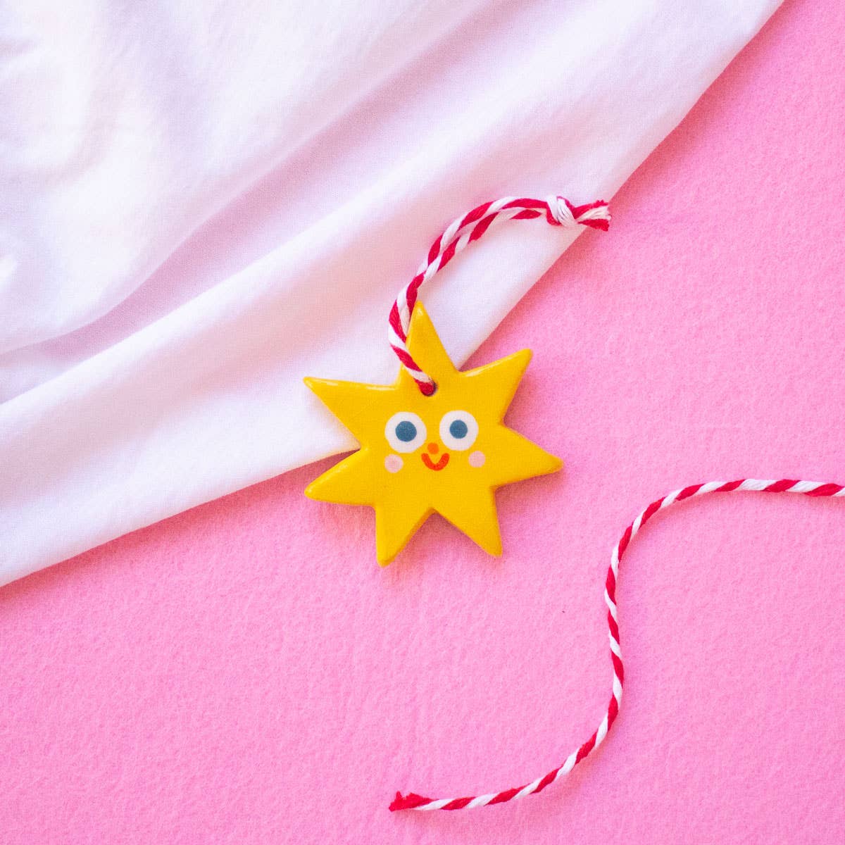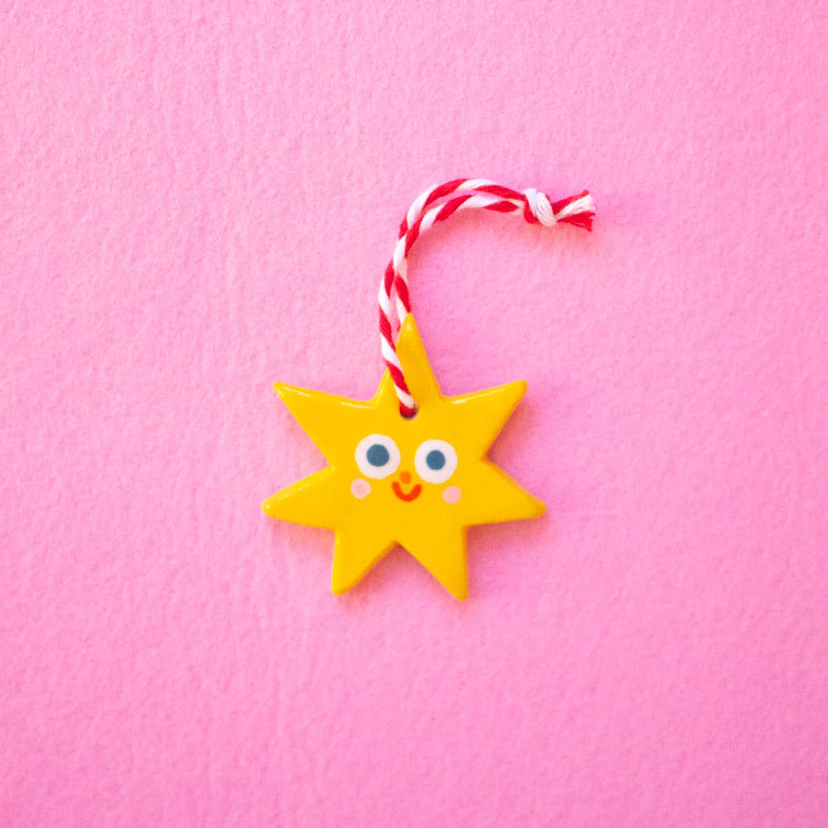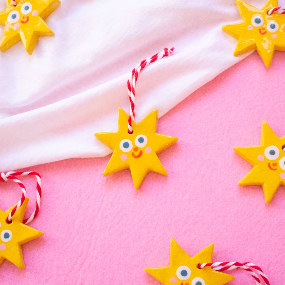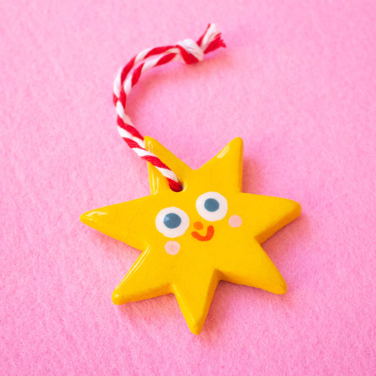 Handgefertigt aus Keramiksteinzeug, von Hand bemalt mit bunten Engoben und mit einer Schicht aus transparentem Glanzglasur für ein glänzendes Aussehen. Jeder Stern wird mit einer bunten Baumwollschnur zum Aufhängen geliefert.