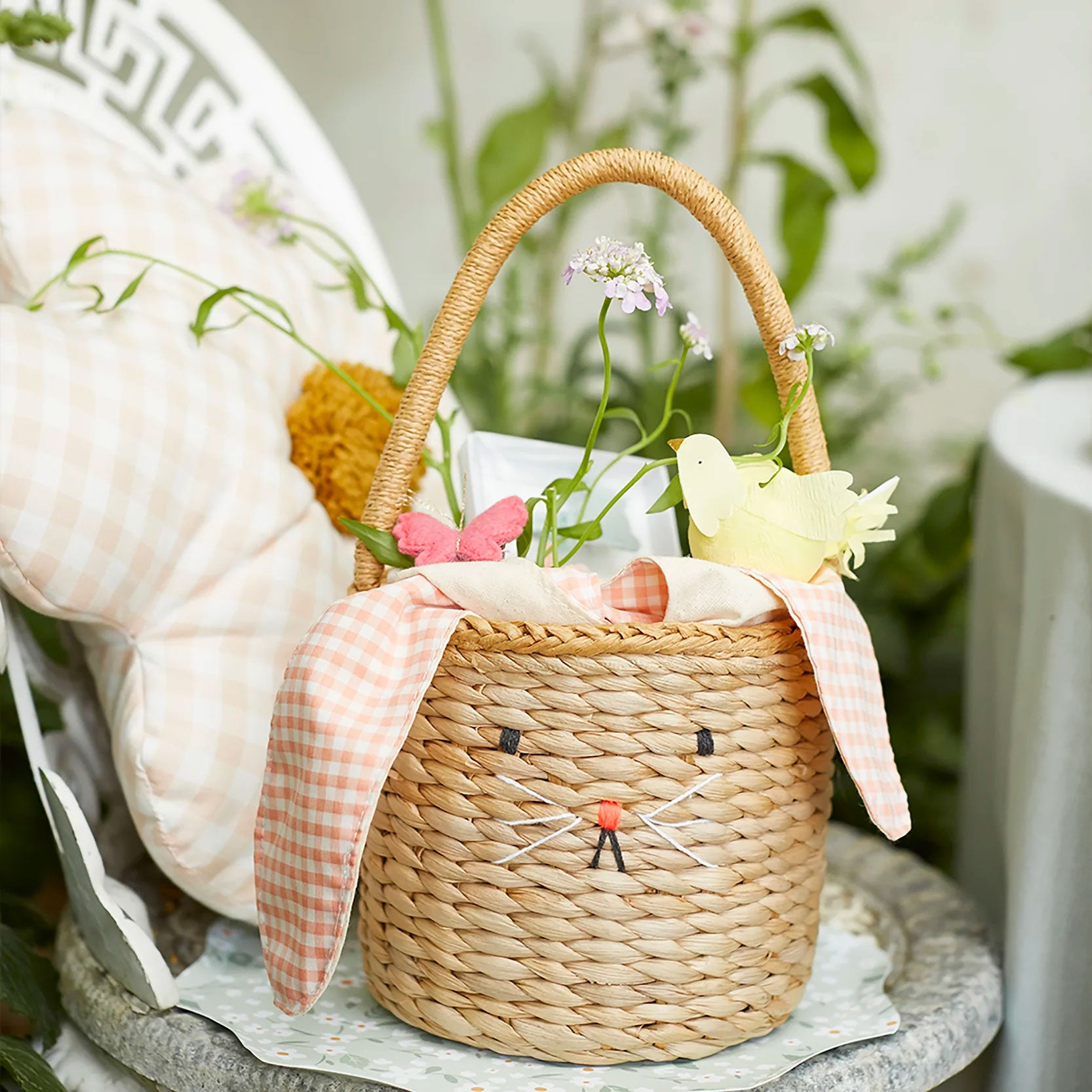 Eine wunderschöne Strohtasche mit süßem Hasengesicht und kariertem Baumwollfutter, lustige Schlappohren und einen niedlichen Pomponschwanz. Der perfekte Osterkorb oder für jeden anderen besonderen Anlass.