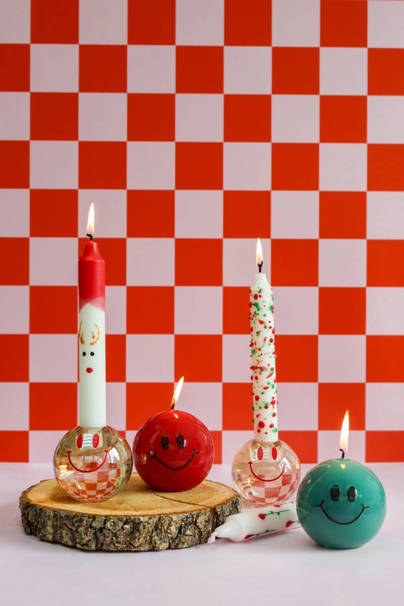 Fröhliche, handgemachte Kerze mit einem 3D-Smiley-Gesicht und glänzendem Finish. Perfekt als Blickfang in Geschenk- oder Einrichtungsgeschäften.