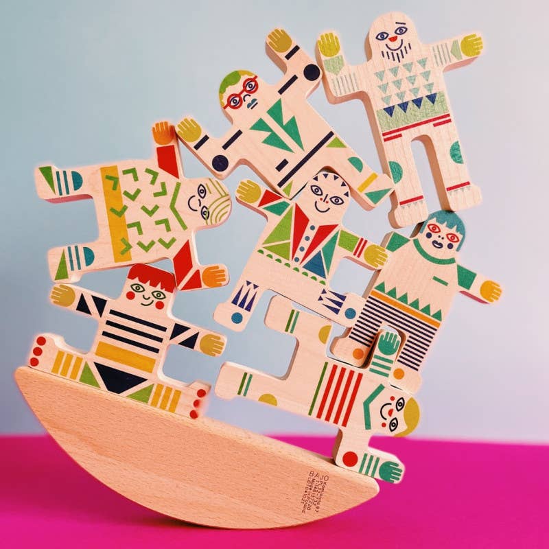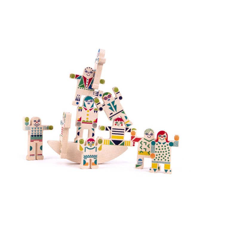 Weltbalance Set aus 10 Holzfiguren – jede anders, einzigartig und unwiederholbar. Genau wie Menschen auf der ganzen Welt. Ziel des Spiels ist es, die Figuren zusammen auszubalancieren, aber es ist mehr als nur ein Geschicklichkeitsspiel – es trägt eine Botschaft.